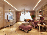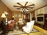 面积的棕色墙漆可能使空间看上去有些沉闷,所以在细微处搭配了一些白色的点缀,白色的垭口,白色的电视背景墙石膏线,以及美式经典的竖条壁纸,和谐之曲再一次凑向。 客厅亮点:皮质与棉布混搭的家具,自然休闲。顶面圆形吊顶又强调了中国“天圆地方”的说法,异域的风情,接受,包容,创新,在这里一一演绎。